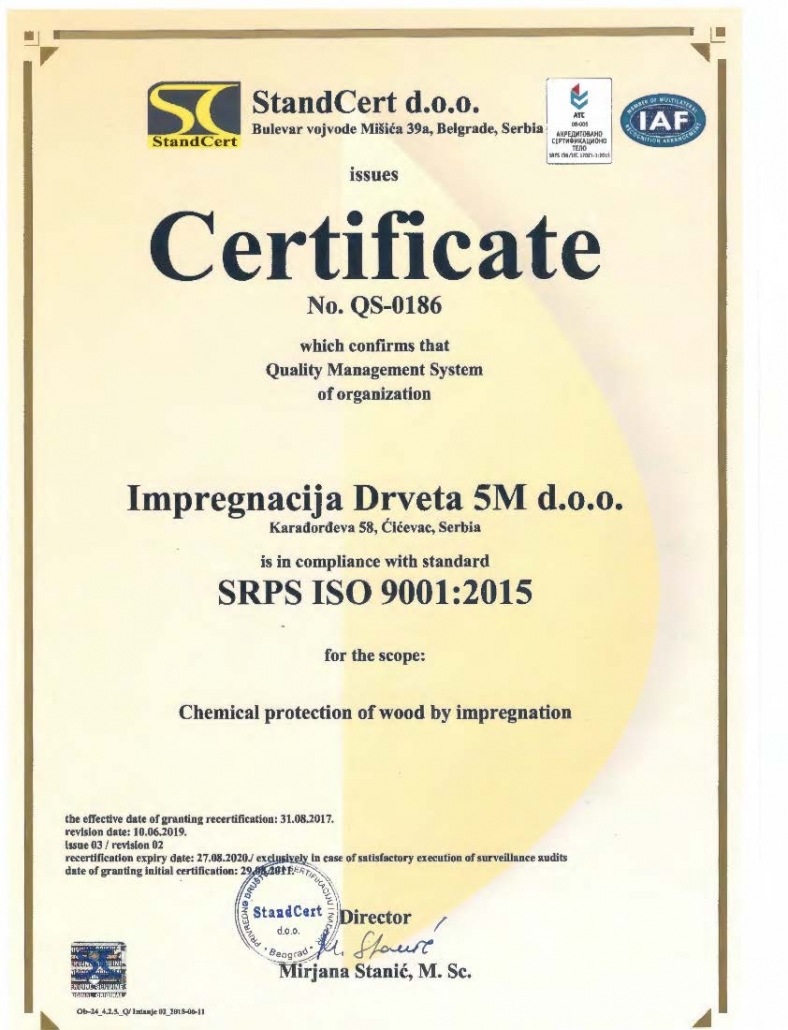 U procesu proizvodnje rukovodimo se najstrožim evropskim standardima koji se odnose na kontrolu kvaliteta i ekološki aspekt. Impregnacija se izvodi novim ekološkim kreozotnim uljem tipa GX-plus(EN13991 tip C), kao i rastvorima neorganskih soli. Jedini u Srbiji posedujemo dozvolu Ministarstva energetike, razvoja i zaštite životne sredine Republike Srbije za uvoz i upotrebu kreozotnog ulja GX – plus (EN13991 tip C) i  dozvolu Ministarstva poljoprivrede i zaštite životne sredine Republike Srbije o pravu uvoza i upotrebe kreozotnog ulja Maderoil Tip C (EN 13991), koja se koriste u crnoj impregnaciji.