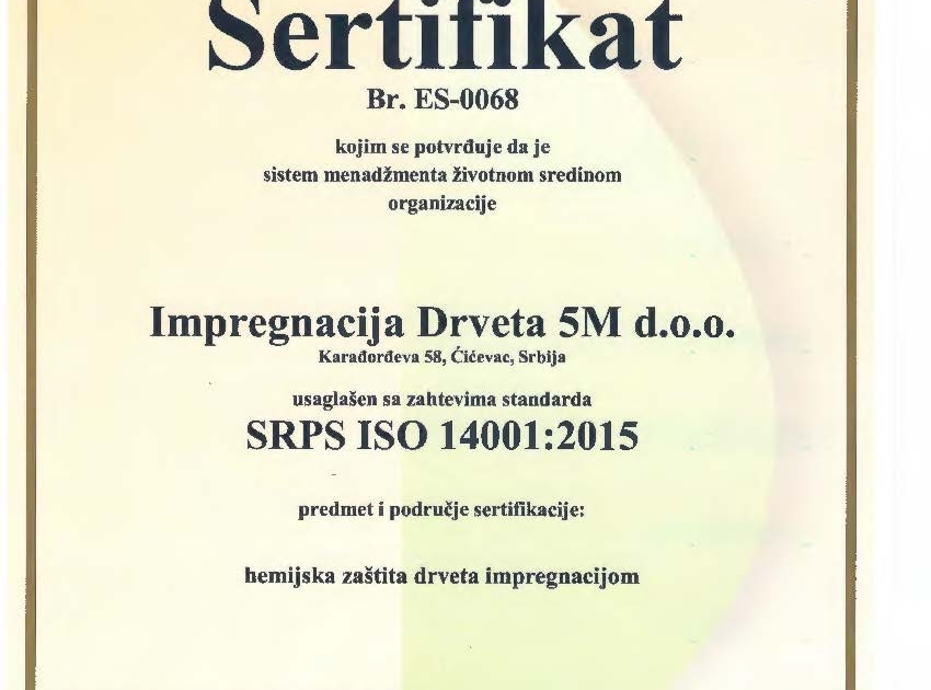 Međunarodni serfitikat ISO 14001:2015 garantuje primenu najviših standarda kvaliteta u svim fazama proizvodnje. Zaštita životne sredine deo je naše dugoročne strategije razvoja. Mi poslujemo u skladu sa svim ekološkim propisima i zahtevima nadležnih institucija za našu delatnost.