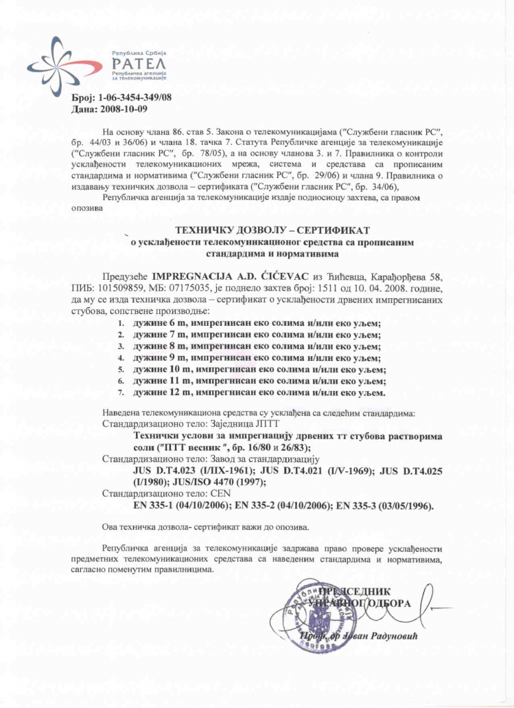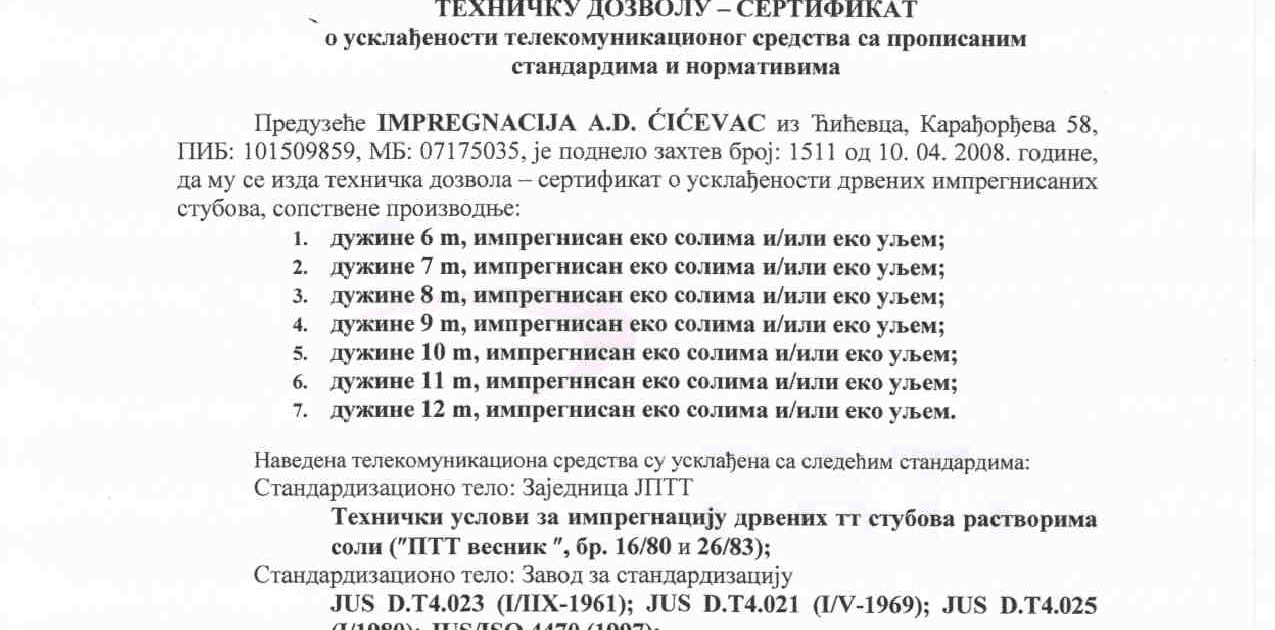 U procesu proizvodnje rukovodimo se najstrožim evropskim standardima koji se odnose na kontrolu kvaliteta i ekološki aspekt. Impregnacija se izvodi novim ekološkim kreozotnim uljem tipa GX-plus(EN13991 tip C), kao i rastvorima neorganskih soli. Jedini u Srbiji posedujemo dozvolu Ministarstva energetike, razvoja i zaštite životne sredine Republike Srbije za uvoz i upotrebu kreozotnog ulja GX – plus (EN13991 tip C) i  dozvolu Ministarstva poljoprivrede i zaštite životne sredine Republike Srbije o pravu uvoza i upotrebe kreozotnog ulja Maderoil Tip C (EN 13991), koja se koriste u crnoj impregnaciji.
